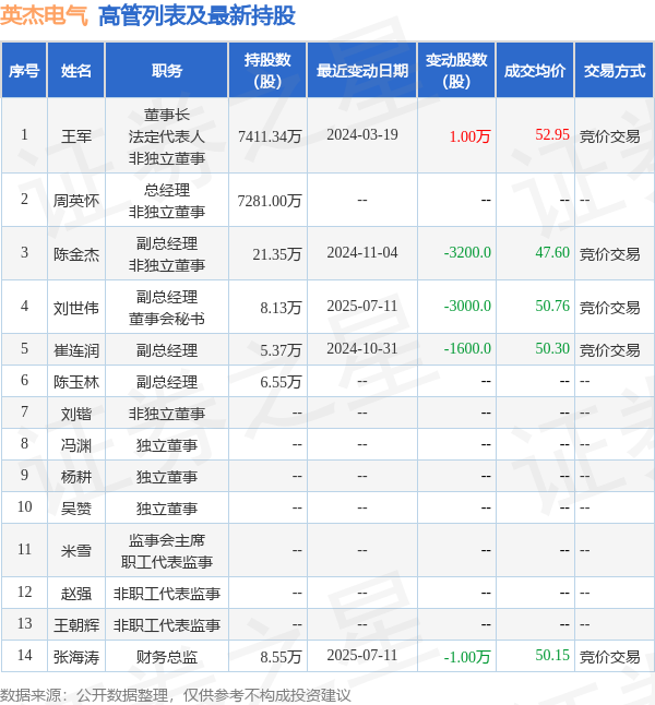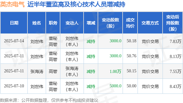 英杰电气近半年内的董监高及核心技术人员增减持详情如下: